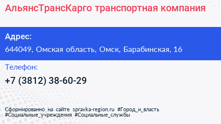 АльянсТрансКарго, транспортная компания по адресу 644049, Омская область, Омск, Барабинская, 16 в дальнейшем Организация, размещена в следующих категориях: