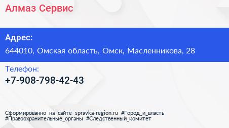 Алмаз Сервис по адресу 644010, Омская область, Омск, Масленникова, 28 в дальнейшем Организация, размещена в следующих категориях: