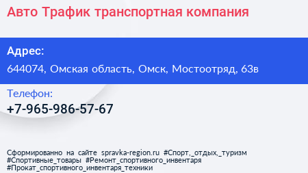 Авто Трафик, транспортная компания по адресу 644074, Омская область, Омск, Мостоотряд, 63в в дальнейшем Организация, размещена в следующих категориях: