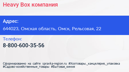 Heavy Box, компания по адресу 644023, Омская область, Омск, Рельсовая, 22 в дальнейшем Организация, размещена в следующих категориях: