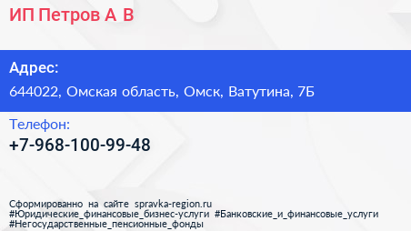 ИП Петров А.В. по адресу 644022, Омская область, Омск, Ватутина, 7Б в дальнейшем Организация, размещена в следующих категориях: