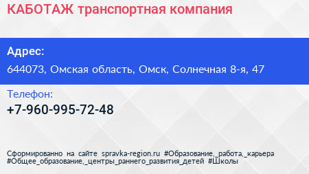 КАБОТАЖ, транспортная компания по адресу 644073, Омская область, Омск, Солнечная 8-я, 47 в дальнейшем Организация, размещена в следующих категориях: