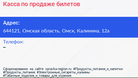 Касса по продаже билетов по адресу 644121, Омская область, Омск, Калинина, 12а в дальнейшем Организация, размещена в следующих категориях: