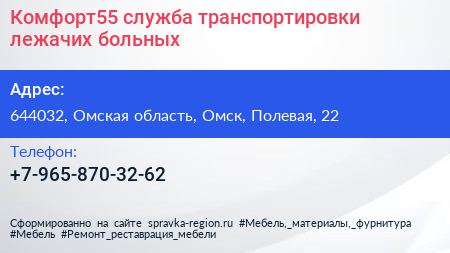 Комфорт55, служба транспортировки лежачих больных по адресу 644032, Омская область, Омск, Полевая, 22 в дальнейшем Организация, размещена в следующих категориях: