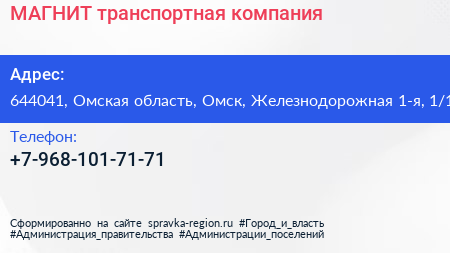 МАГНИТ, транспортная компания по адресу 644041, Омская область, Омск, Железнодорожная 1-я, 1/1 в дальнейшем Организация, размещена в следующих категориях: