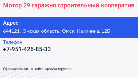 Мотор 29, гаражно-строительный кооператив по адресу 644121, Омская область, Омск, Калинина, 12Б в дальнейшем Организация, размещена в следующих категориях: