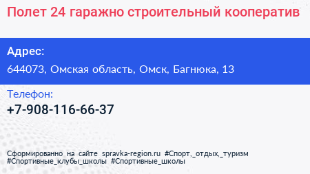 Полет-24, гаражно-строительный кооператив по адресу 644073, Омская область, Омск, Багнюка, 13 в дальнейшем Организация, размещена в следующих категориях: