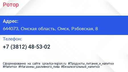 Ротор по адресу 644073, Омская область, Омск, Рэбовская, 8 в дальнейшем Организация, размещена в следующих категориях: