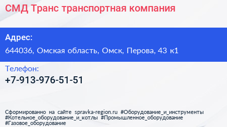 СМД Транс, транспортная компания по адресу 644036, Омская область, Омск, Перова, 43 к1 в дальнейшем Организация, размещена в следующих категориях: