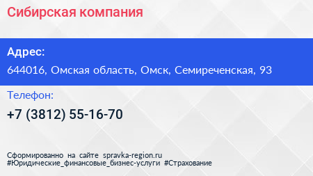 Сибирская, компания по адресу 644016, Омская область, Омск, Семиреченская, 93 в дальнейшем Организация, размещена в следующих категориях: