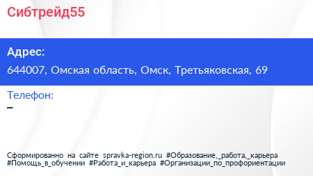 Сибтрейд55 по адресу 644007, Омская область, Омск, Третьяковская, 69 в дальнейшем Организация, размещена в следующих категориях:
