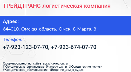 ТРЕЙДТРАНС, логистическая компания по адресу 644010, Омская область, Омск, 8 Марта, 8 в дальнейшем Организация, размещена в следующих категориях: