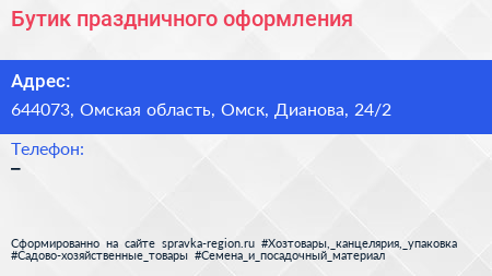 Бутик праздничного оформления по адресу 644073, Омская область, Омск, Дианова, 24/2 в дальнейшем Организация, размещена в следующих категориях: