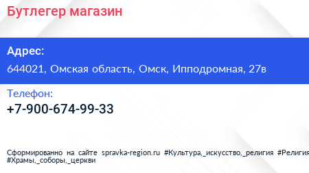 Бутлегер, магазин по адресу 644021, Омская область, Омск, Ипподромная, 27в в дальнейшем Организация, размещена в следующих категориях: