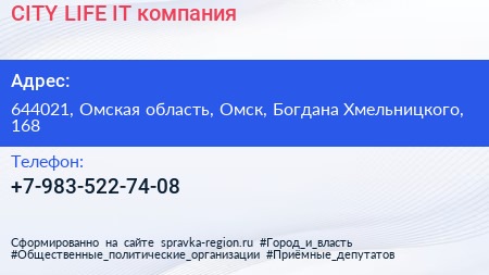 CITY LIFE, IT-компания по адресу 644021, Омская область, Омск, Богдана Хмельницкого, 168 в дальнейшем Организация, размещена в следующих категориях: