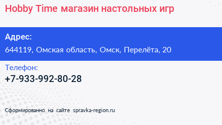 Hobby Time, магазин настольных игр по адресу 644119, Омская область, Омск, Перелёта, 20 в дальнейшем Организация, размещена в следующих категориях: