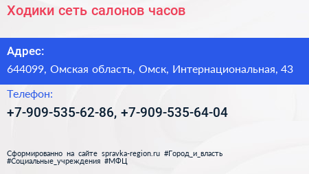 Ходики, сеть салонов часов по адресу 644099, Омская область, Омск, Интернациональная, 43 в дальнейшем Организация, размещена в следующих категориях: