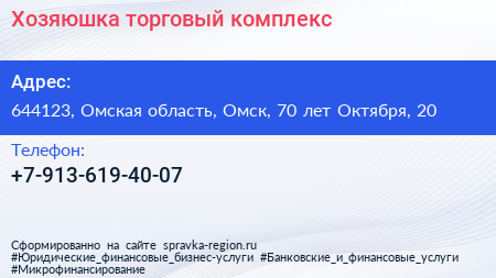 Хозяюшка, торговый комплекс по адресу 644123, Омская область, Омск, 70 лет Октября, 20 в дальнейшем Организация, размещена в следующих категориях: