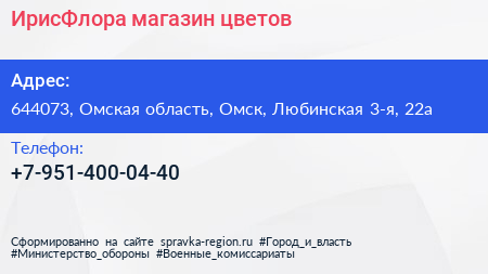 ИрисФлора, магазин цветов по адресу 644073, Омская область, Омск, Любинская 3-я, 22а в дальнейшем Организация, размещена в следующих категориях: