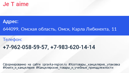Je T’aime по адресу 644099, Омская область, Омск, Карла Либкнехта, 11 в дальнейшем Организация, размещена в следующих категориях: