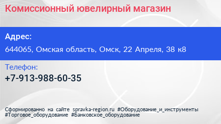 Комиссионный ювелирный магазин по адресу 644065, Омская область, Омск, 22 Апреля, 38 к8 в дальнейшем Организация, размещена в следующих категориях: