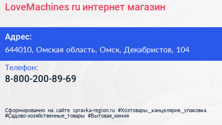 LoveMachines.ru, интернет-магазин по адресу 644010, Омская область, Омск, Декабристов, 104 в дальнейшем Организация, размещена в следующих категориях: