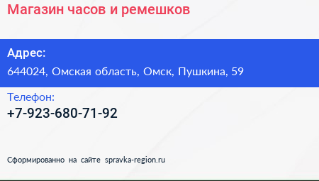Магазин часов и ремешков по адресу 644024, Омская область, Омск, Пушкина, 59 в дальнейшем Организация, размещена в следующих категориях: