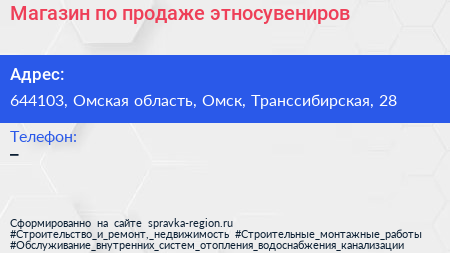 Магазин по продаже этносувениров по адресу 644103, Омская область, Омск, Транссибирская, 28 в дальнейшем Организация, размещена в следующих категориях: