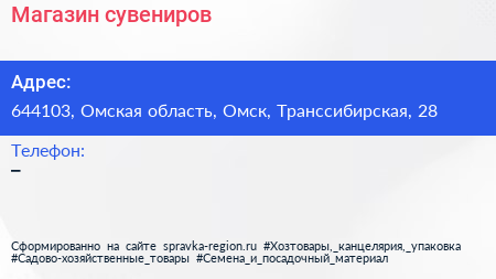 Магазин сувениров по адресу 644103, Омская область, Омск, Транссибирская, 28 в дальнейшем Организация, размещена в следующих категориях: