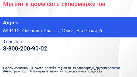 Магнит у дома, сеть супермаркетов по адресу 644112, Омская область, Омск, Взлётная, 6 в дальнейшем Организация, размещена в следующих категориях: