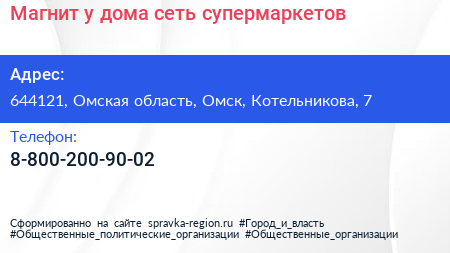 Магнит у дома, сеть супермаркетов по адресу 644121, Омская область, Омск, Котельникова, 7 в дальнейшем Организация, размещена в следующих категориях: