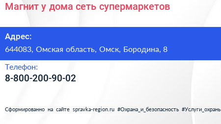 Магнит у дома, сеть супермаркетов по адресу 644083, Омская область, Омск, Бородина, 8 в дальнейшем Организация, размещена в следующих категориях: