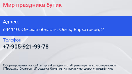 Мир праздника, бутик по адресу 644110, Омская область, Омск, Бархатовой, 2 в дальнейшем Организация, размещена в следующих категориях: