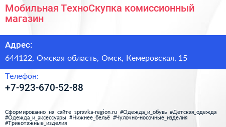 Мобильная ТехноСкупка, комиссионный магазин по адресу 644122, Омская область, Омск, Кемеровская, 15 в дальнейшем Организация, размещена в следующих категориях: