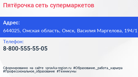 Пятёрочка, сеть супермаркетов по адресу 644025, Омская область, Омск, Василия Маргелова, 194/1 в дальнейшем Организация, размещена в следующих категориях: