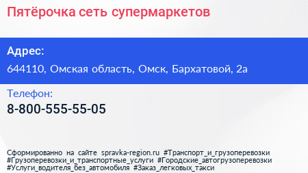 Пятëрочка, сеть супермаркетов по адресу 644110, Омская область, Омск, Бархатовой, 2а в дальнейшем Организация, размещена в следующих категориях: