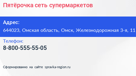 Пятëрочка, сеть супермаркетов по адресу 644023, Омская область, Омск, Железнодорожная 3-я, 11 в дальнейшем Организация, размещена в следующих категориях: