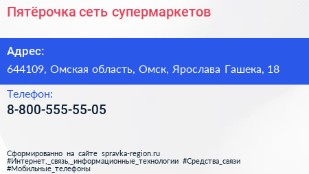 Пятëрочка, сеть супермаркетов по адресу 644109, Омская область, Омск, Ярослава Гашека, 18 в дальнейшем Организация, размещена в следующих категориях: