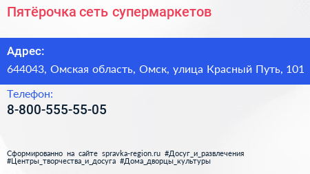 Пятëрочка, сеть супермаркетов по адресу 644043, Омская область, Омск, улица Красный Путь, 101 в дальнейшем Организация, размещена в следующих категориях: