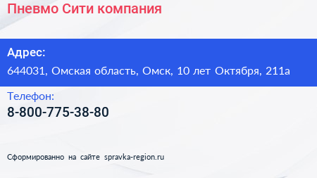 Пневмо-Сити, компания по адресу 644031, Омская область, Омск, 10 лет Октября, 211а в дальнейшем Организация, размещена в следующих категориях: