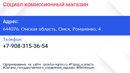 Социал, комиссионный магазин по адресу 644076, Омская область, Омск, Романенко, 4 в дальнейшем Организация, размещена в следующих категориях: