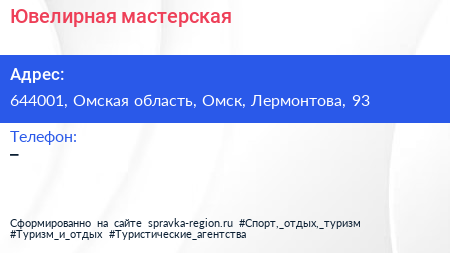 Ювелирная мастерская по адресу 644001, Омская область, Омск, Лермонтова, 93 в дальнейшем Организация, размещена в следующих категориях: