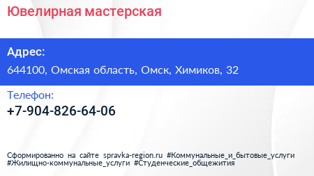 Ювелирная мастерская по адресу 644100, Омская область, Омск, Химиков, 32 в дальнейшем Организация, размещена в следующих категориях: