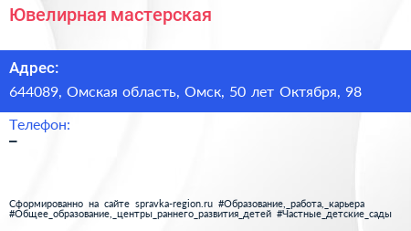 Ювелирная мастерская по адресу 644089, Омская область, Омск, 50 лет Октября, 98 в дальнейшем Организация, размещена в следующих категориях: