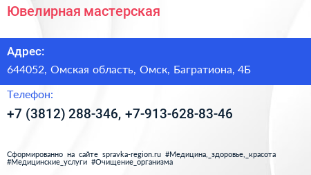 Ювелирная мастерская по адресу 644052, Омская область, Омск, Багратиона, 4Б в дальнейшем Организация, размещена в следующих категориях: