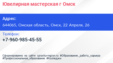 Ювелирная мастерская, г. Омск по адресу 644065, Омская область, Омск, 22 Апреля, 26 в дальнейшем Организация, размещена в следующих категориях: