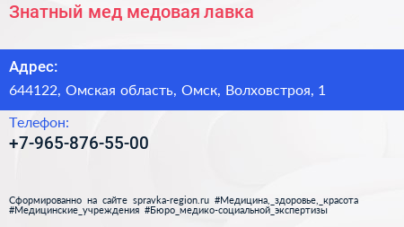 Знатный мед, медовая лавка по адресу 644122, Омская область, Омск, Волховстроя, 1 в дальнейшем Организация, размещена в следующих категориях: