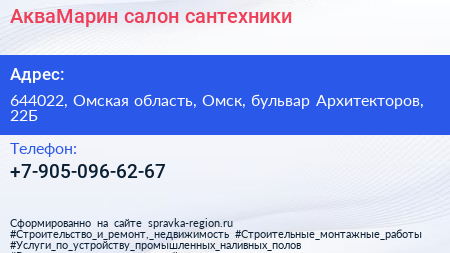 АкваМарин, салон сантехники по адресу 644022, Омская область, Омск, бульвар Архитекторов, 22Б в дальнейшем Организация, размещена в следующих категориях: