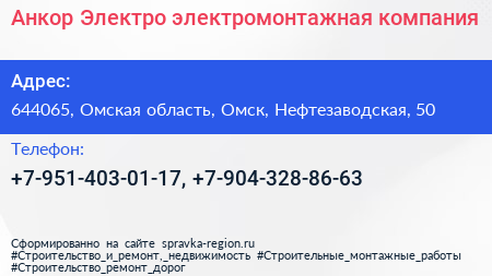 Анкор-Электро, электромонтажная компания по адресу 644065, Омская область, Омск, Нефтезаводская, 50 в дальнейшем Организация, размещена в следующих категориях: