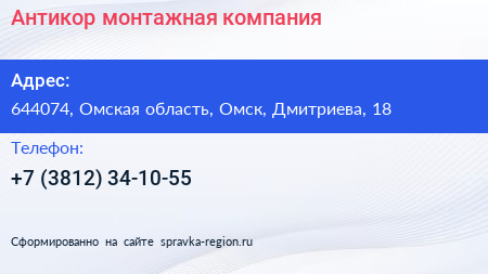 Антикор, монтажная компания по адресу 644074, Омская область, Омск, Дмитриева, 18 в дальнейшем Организация, размещена в следующих категориях: